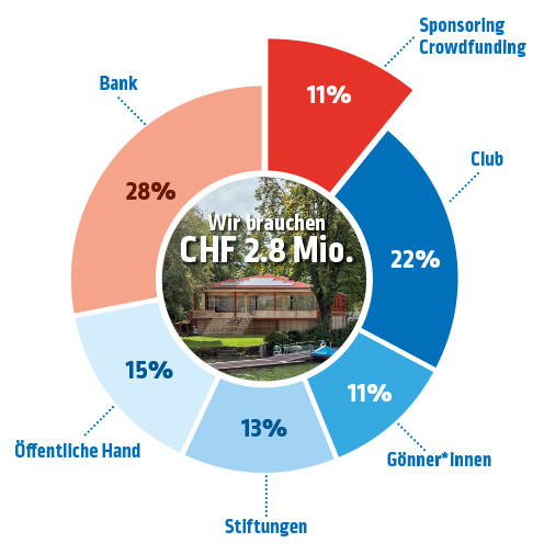 Die Finanzierung ist auf gutem Weg durch die grosszügige Unterstützung der Stadt Luzern, des Kantons Luzern, durch Spenden, Stiftungs- gelder sowie Vereinsvermögen und die hohe Bereitschaft unserer Clubmitglieder zu Eigenleistungen und ehrenamtlichem Engagement. Den fehlenden Betrag von CHF 800 000.– möchten wir über Crowdfunding und Beiträge von Sponsor*innen, Stiftungen und Gönner*innen decken.